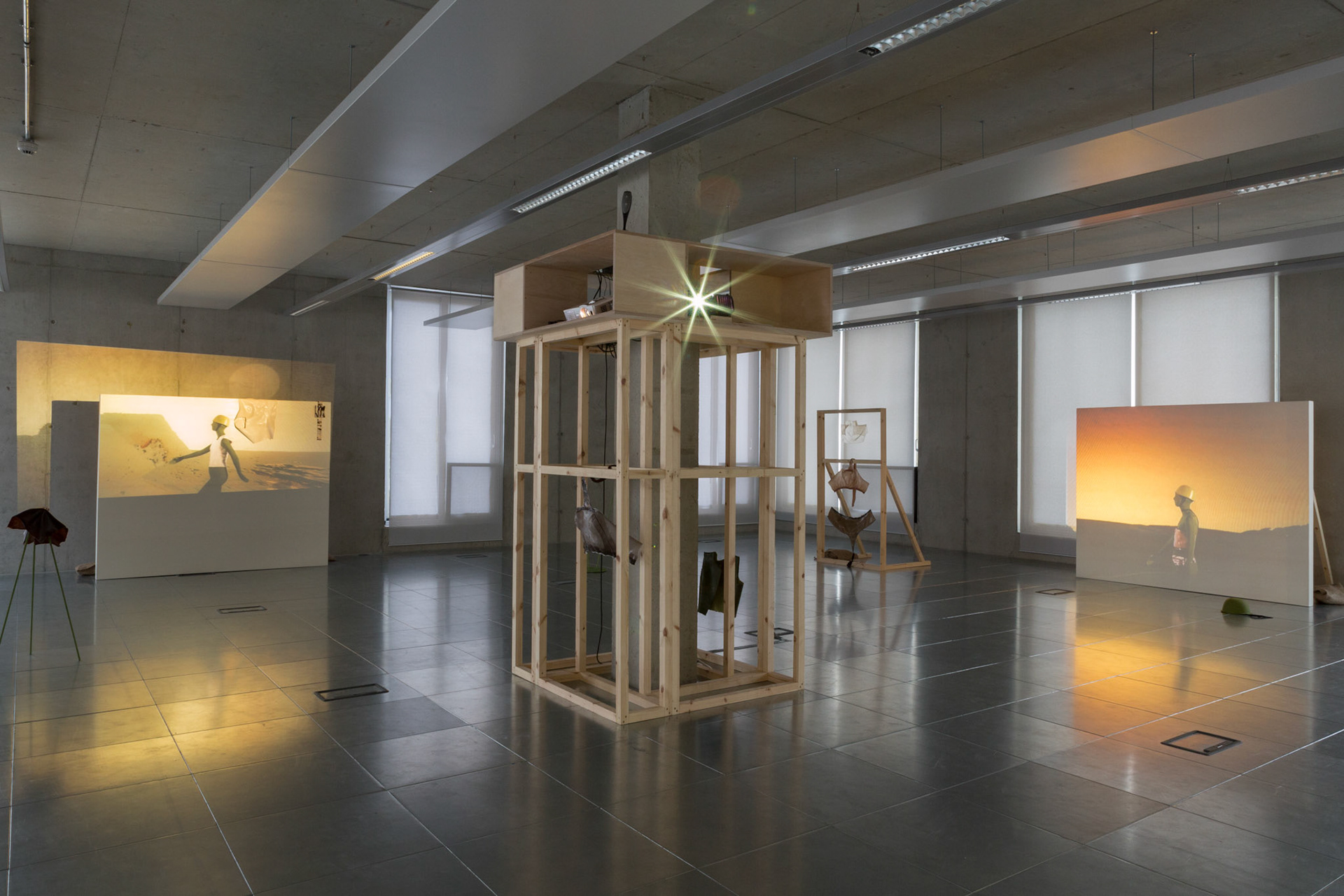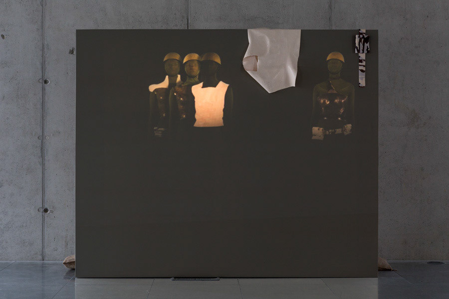 AS YOU WERE examined analogies between military indoctrination and post-industrial manufacture in consumer culture. The installation included multi-channelled audio-visual projections that simulate a fashion show cum military drill. The projections displayed a lone figure parodying as a toy soldier marching through a scene that resembled a desert-scape or an extra-terrestrial environment. As the video progressed the lone soldier became two, three and four, eventually forming a small army.