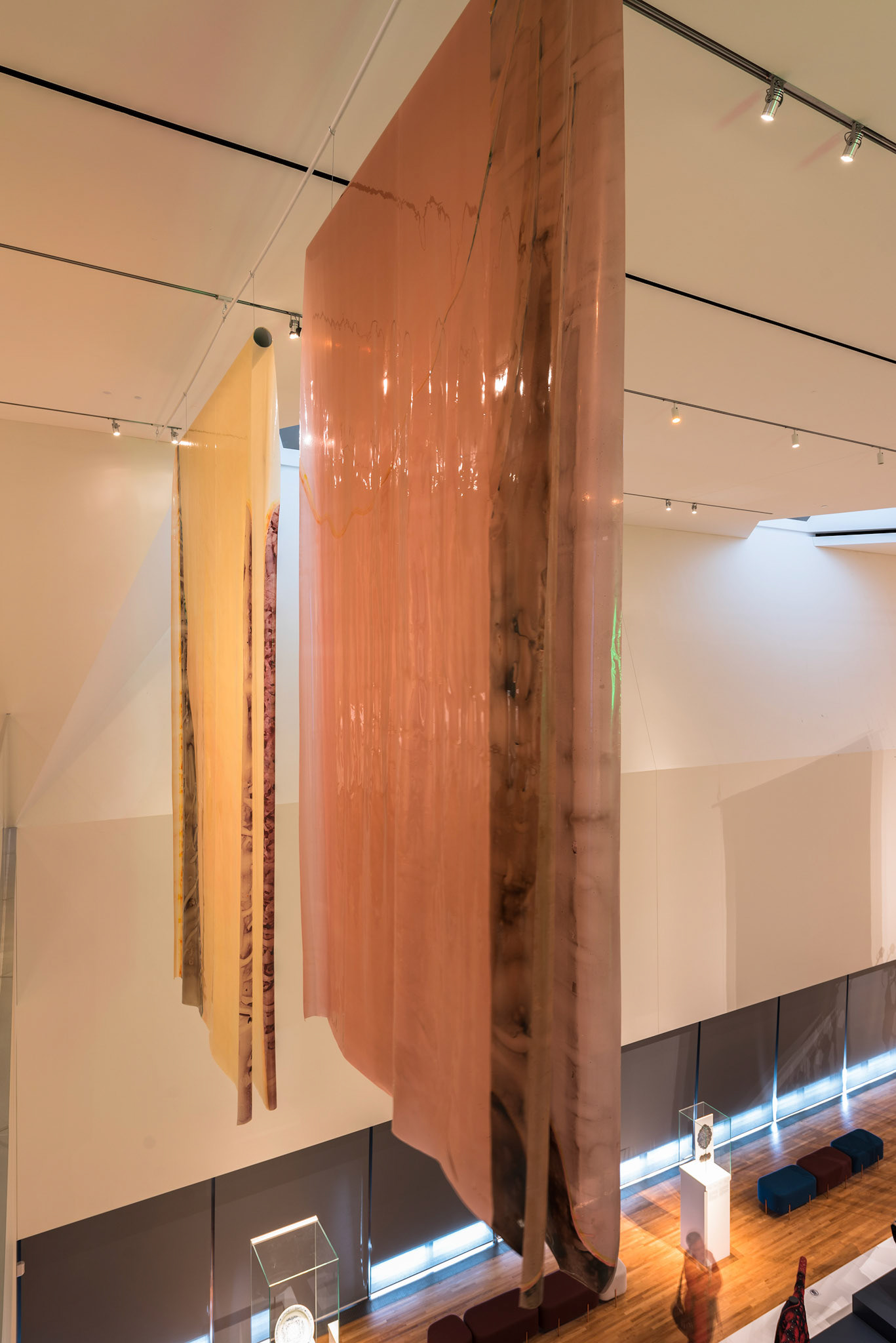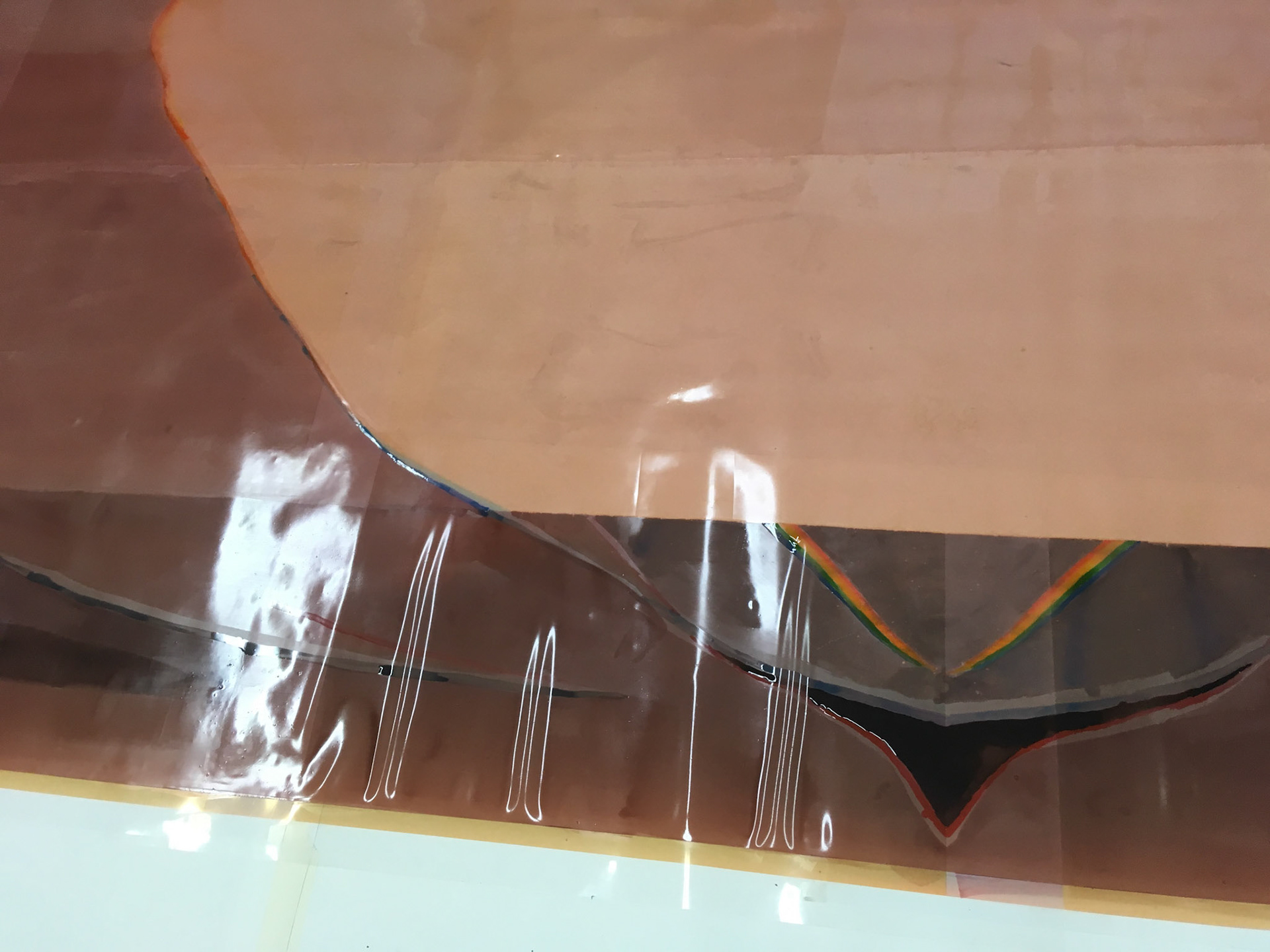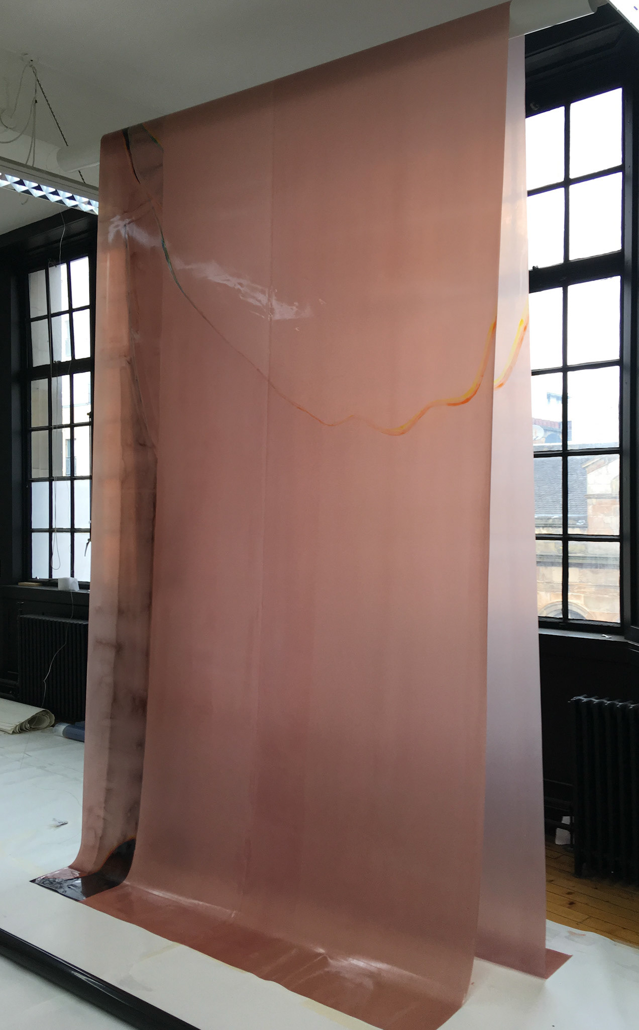 In this commissioned work I use latex, varnish and inks to reference rugs and screens, both historically and in relation to personal movements and habitation in various countries and homes. Rolled and unrolled, rugs form the initial act of marking a home for nomads. Hung from the walls of tents, they depict narratives and track a history of communal craft.