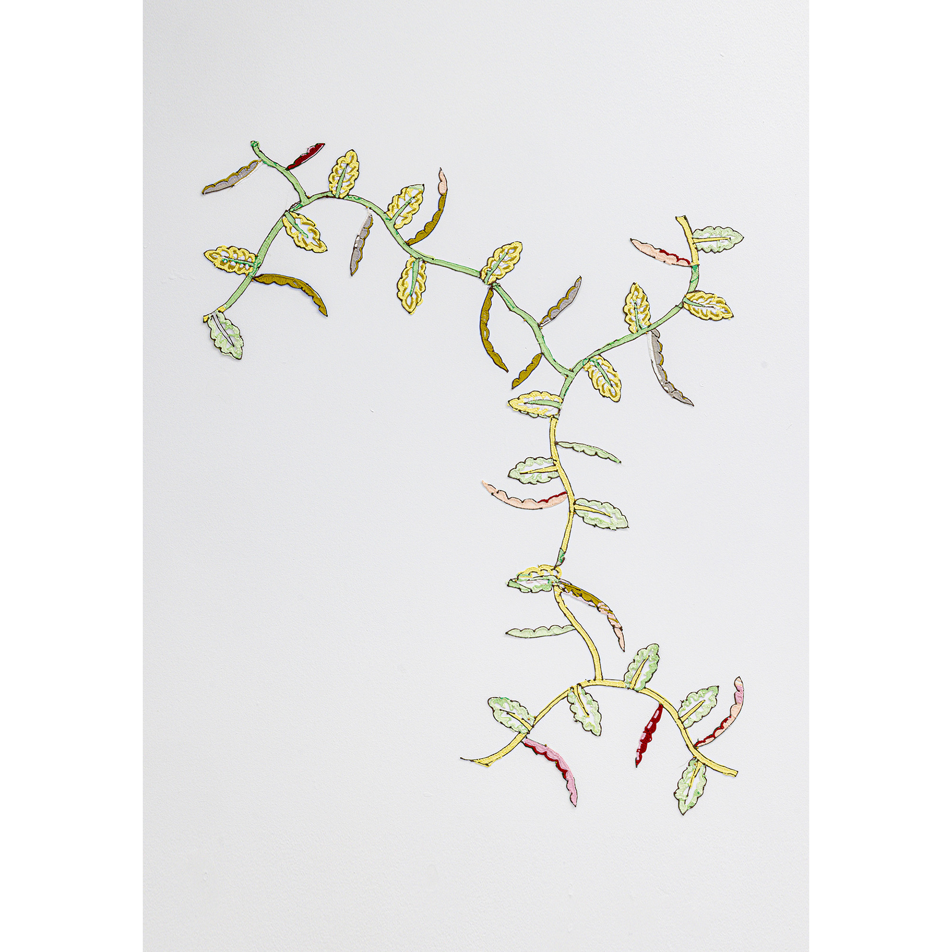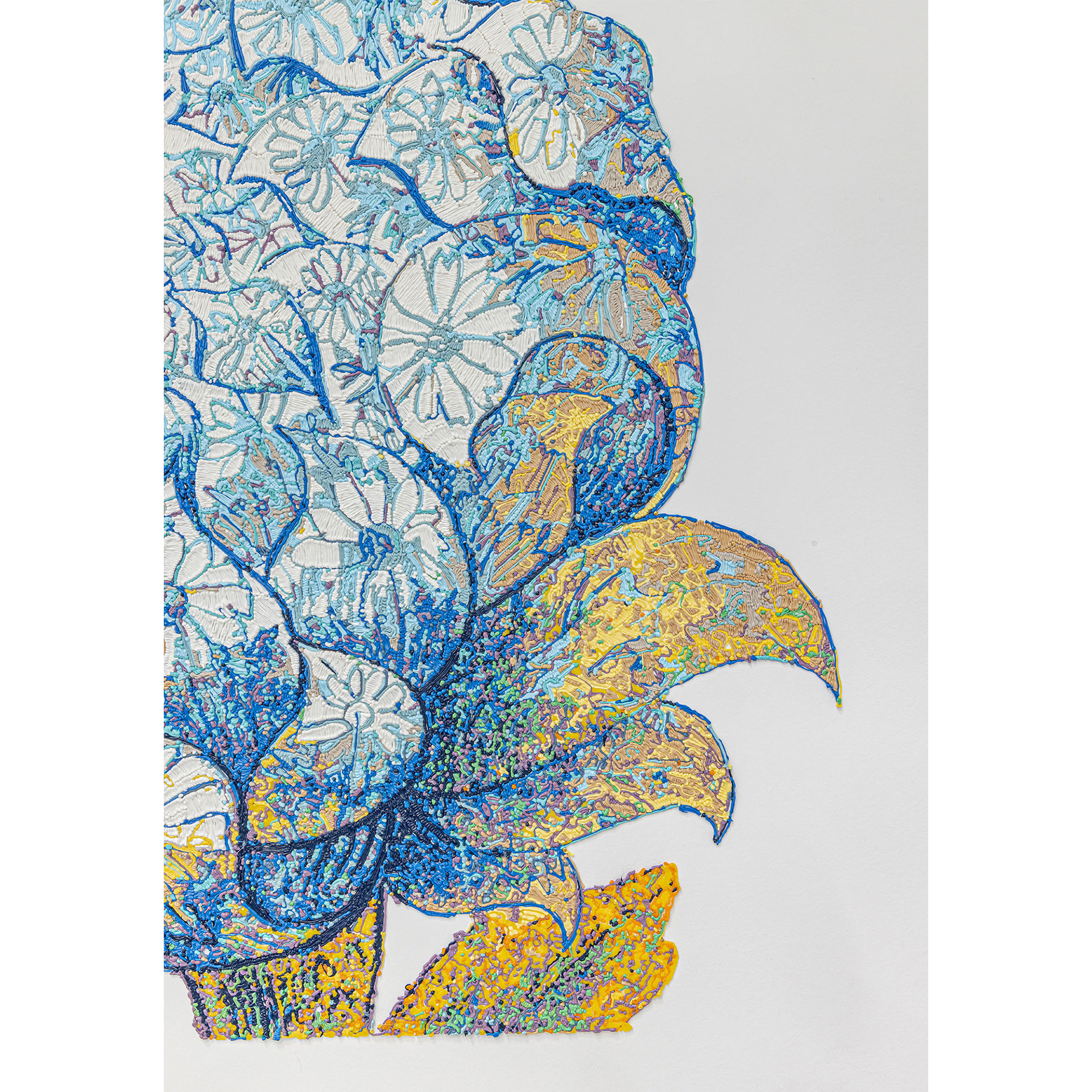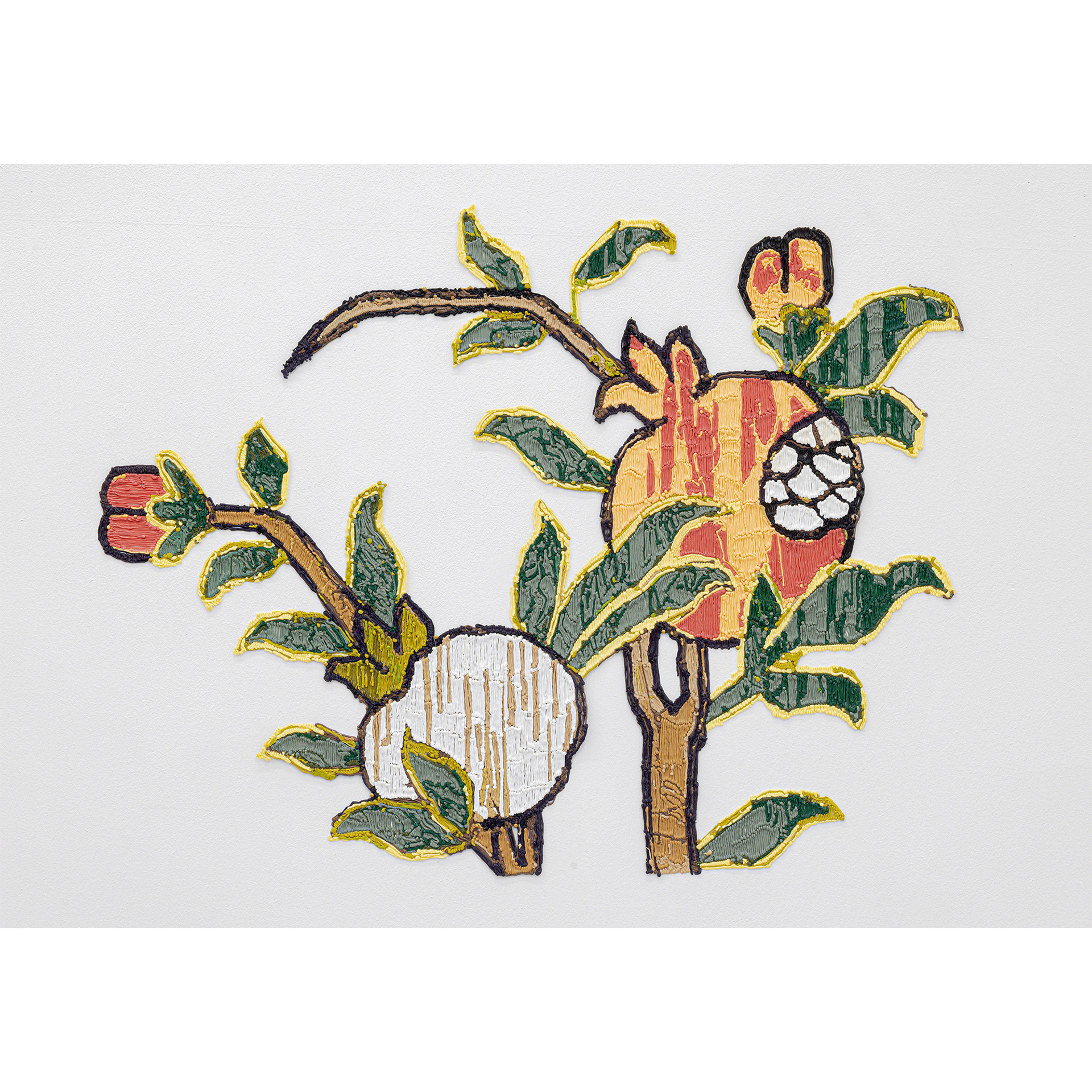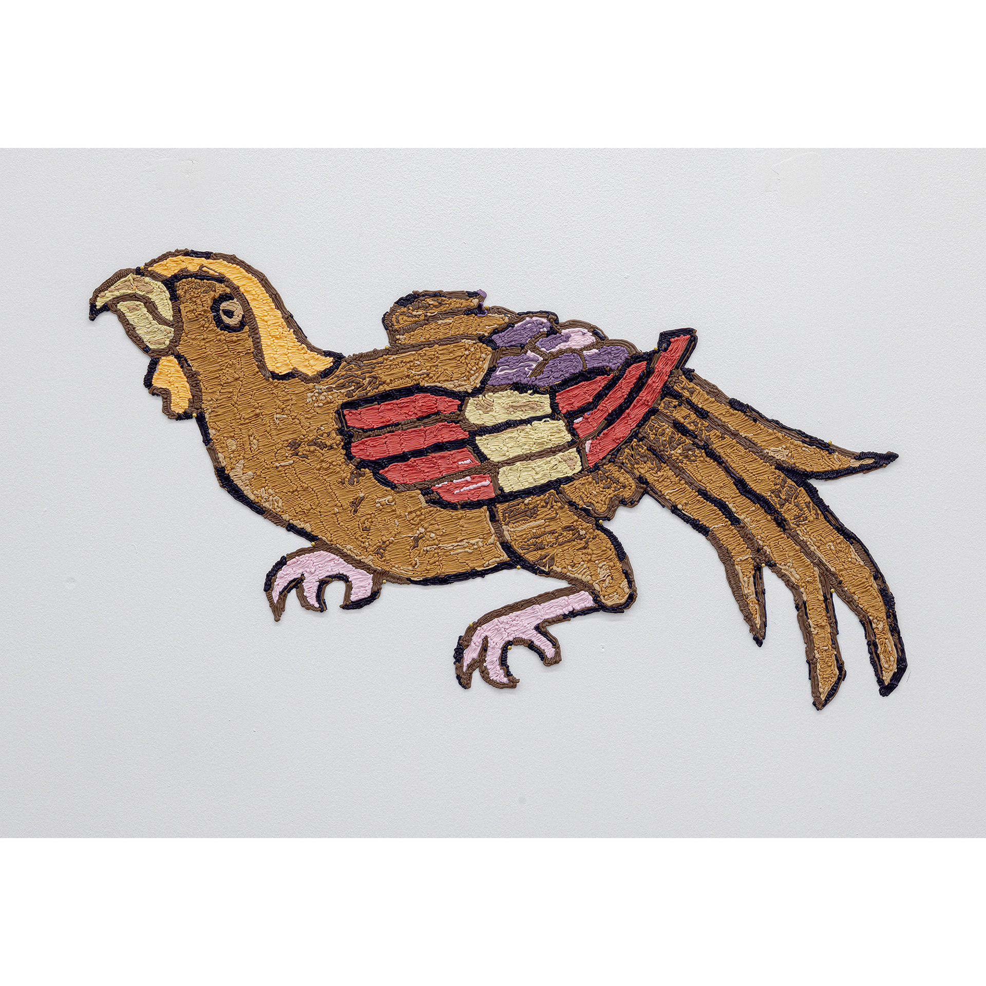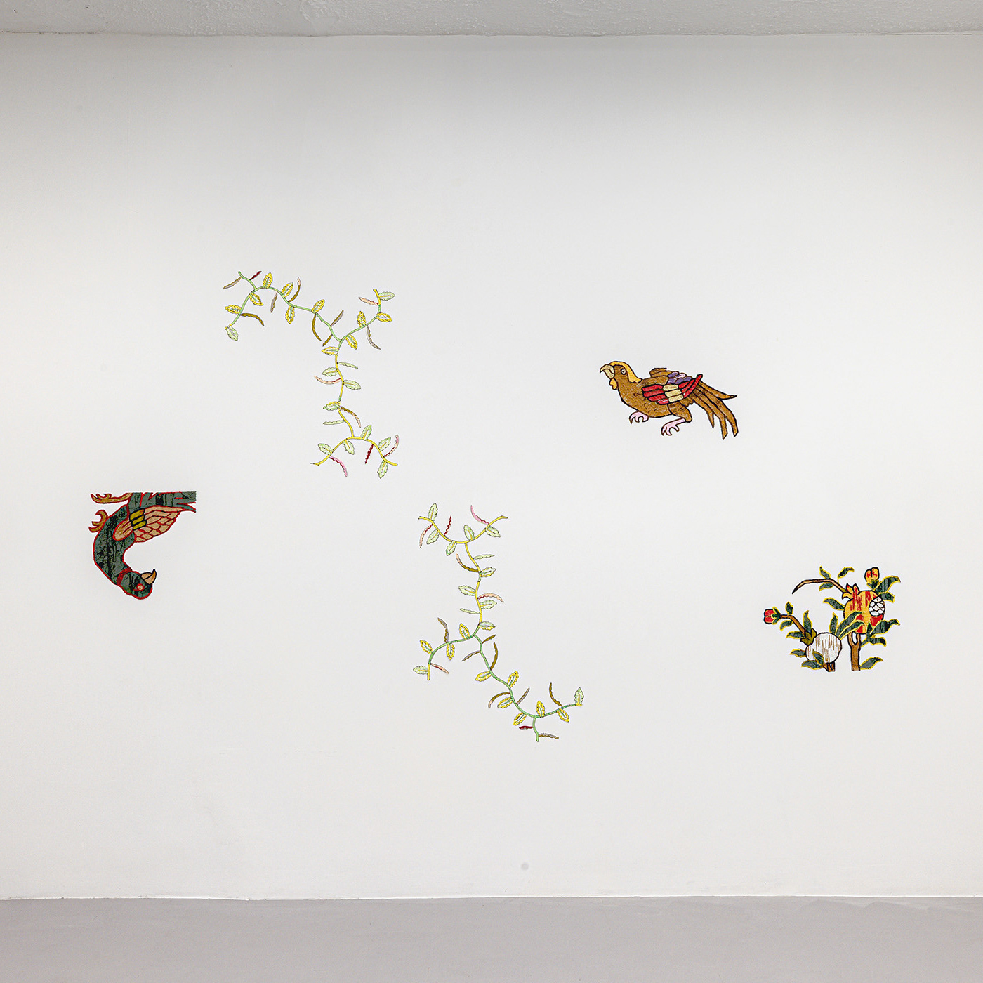 Exploring histories of textiles as sites of cultural exchange, appropriation and transformation, Sukaina Kubba draws attention to the formal elements of their design. Using a 3D filament pen, the artist reproduces characters from Persain rugs. Here anthropomorphized pomegranates, larger than life peonies and awkwardly contorted birds are taken out of woven patterns and placed on the gallery walls. These motifs are reappropriated from Scottish carpet manufactures, Stoddard-Templeton (1871–2006) who sent their designers to copy Persian rugs.