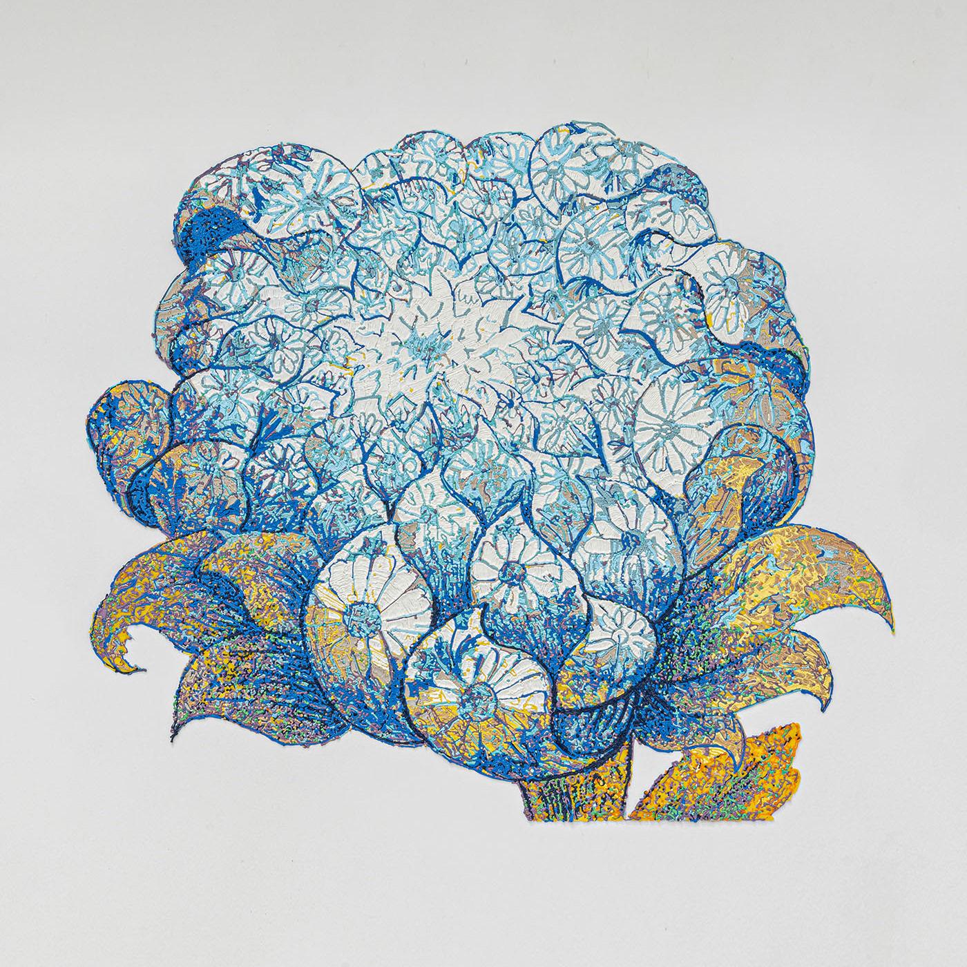 Expanding her practice of beadwork from three to two dimensions, Olivia Whetung’s digital beading prints, Unplanned Offerings, describe experiences of mutual benefit between species. Here a chipmunk, goldfinch and bumblebee are depicted alongside aster, goldenrod, echinacea, chives and potatoes cultivated by the artist in her garden. These works connect to Whetung’s broader concerns of interdependency and food sovereignty across human and non-human worlds.